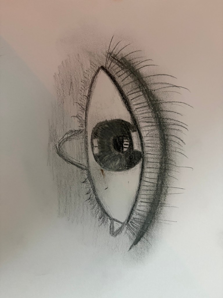Today I used pencils to draw an eye and a little charcoal for smudging… this is it so far ….